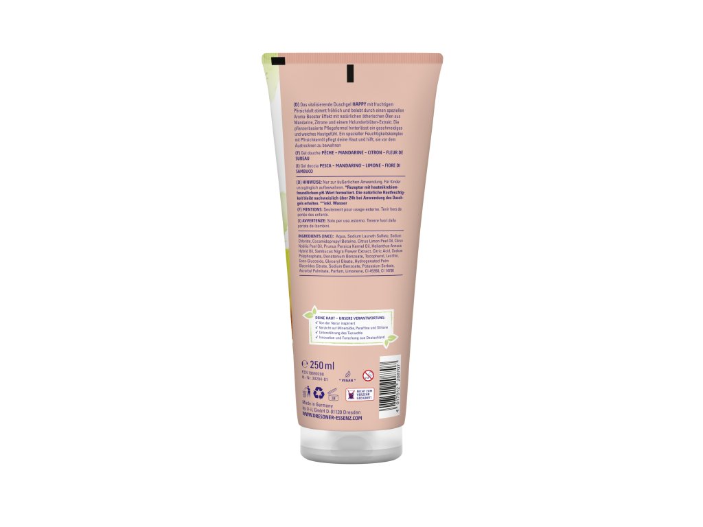Začni deň s osviežením a dobrou náladou! Sprchový gél **HAPPY** s ovocnou vôňou broskyne a citrusov ti dodá energiu a vitalitu vďaka prírodným olejkom z mandarínky, citróna a extraktu z kvetu bazy čiernej.