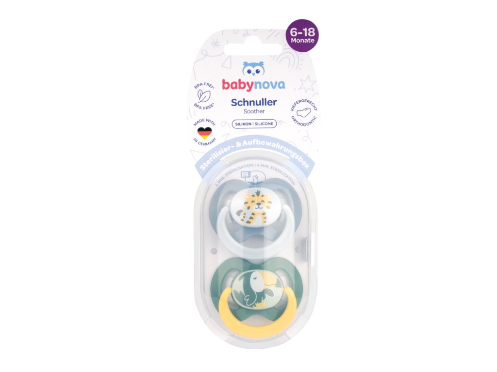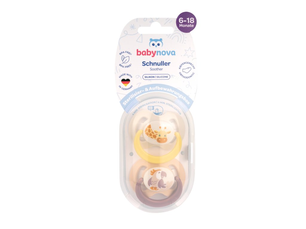 Utišujúci cumlík Baby Nova šetrný k čeľusti podporuje prirodzený vývoj mliečnych zubov vďaka anatomicky tvarovanému cumlíku.
