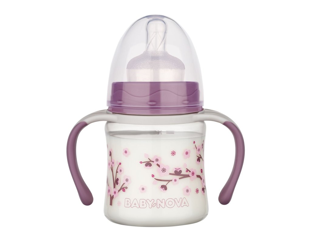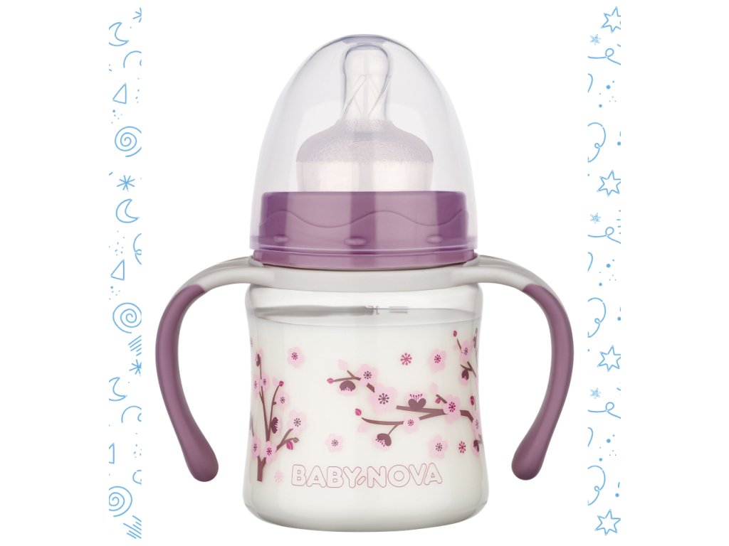 Dojčenská fľaša s rukoväťami Baby Nova s potlačou čerešňového kvetu alebo púpavy. Fľaša je vybavená okrúhlym silikónovým cumlíkom v jednej veľkosti Uni pre dojčatá a deti od 0 - 24 mesiacov. Veľký otvor fľaše umožňuje veľmi jednoduché plnenie a čistenie. Súčasťou balenia je aj skrutkovací krúžok s viečkom a ochranný uzáver.