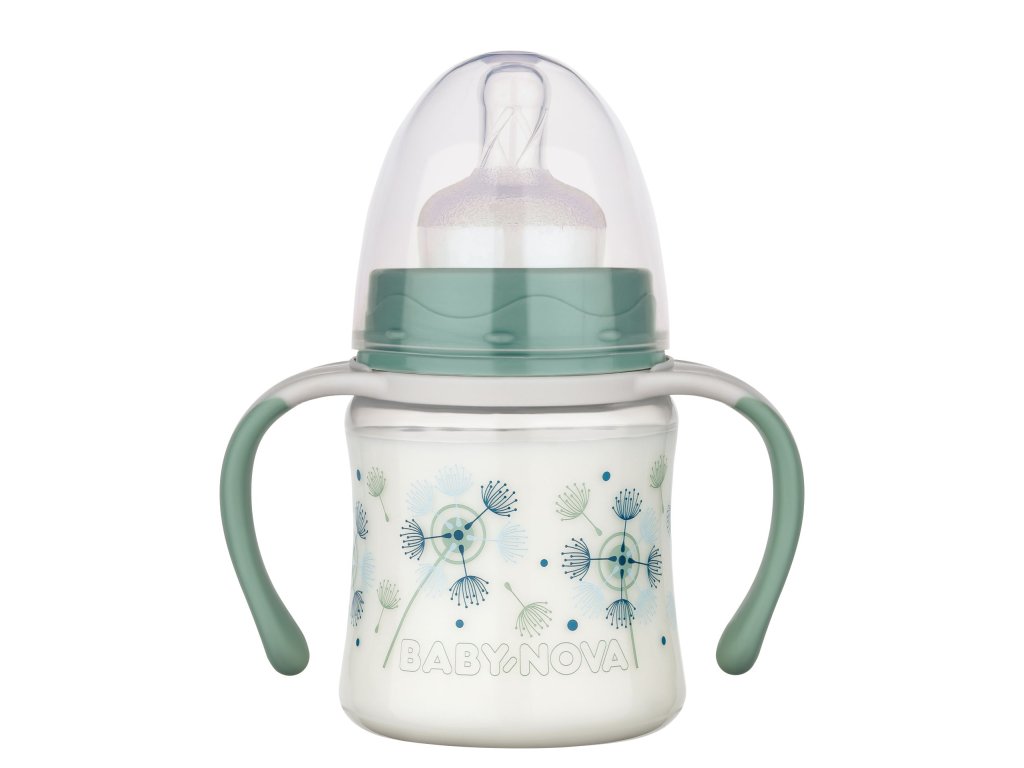 Dojčenská fľaša s rukoväťami Baby Nova s potlačou čerešňového kvetu alebo púpavy s objemom 150 ml a širokým hrdlom.