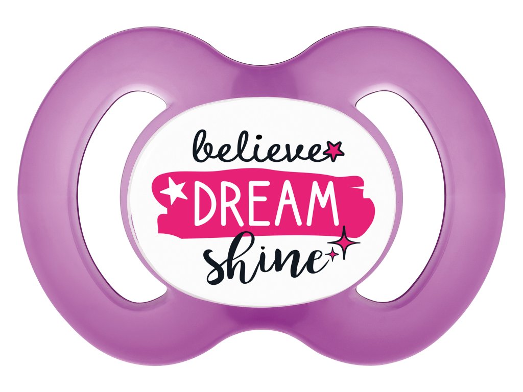 Symetricky tvarovaný utišujúci cumlík bez krúžku. Balenie obsahuje 2 ks.