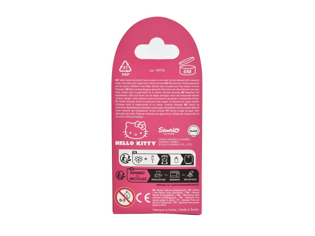 Tento trblietavý ružový lak je ako malá fľaštička kúzla – plná hviezdičiek, ligotavých odleskov a šarmu Hello Kitty. Je na báze vody, takže sa nanáša ľahko a dá sa jednoducho odstrániť teplou vodou – ideálne aj pre malé parádnice.
