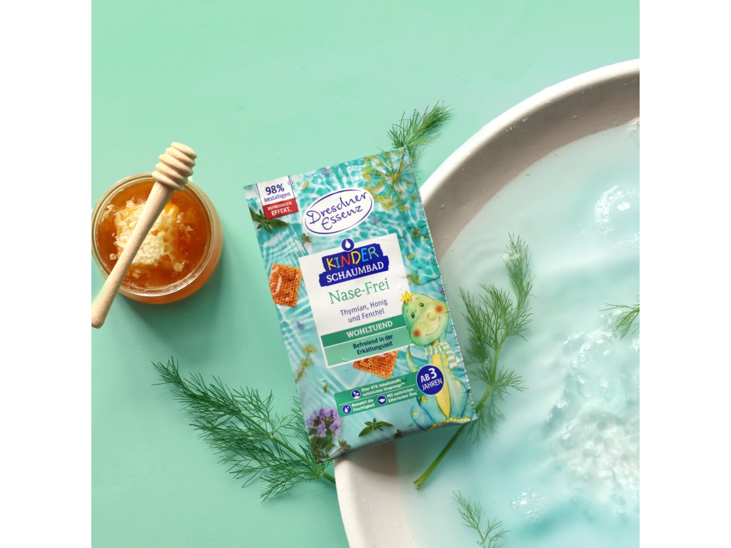 Špeciálne vyvinutý pre deti počas nádchy – jemná pena s prírodnými olejmi z tymiánu a feniklu uvoľňuje dýchacie cesty a pomáha deťom ľahšie dýchať.