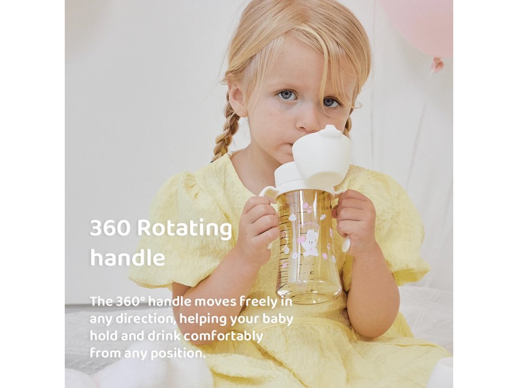 Hrnček je vybavený ergonomickými rukoväťami, ktoré sa otáčajú o 360°, čo umožňuje dieťaťu pohodlne držať fľašu z akéhokoľvek uhla. Rukoväte sú navrhnuté pre malé detské rúčky a podporujú samostatnosť pri pití. Rotačný mechanizmus znižuje zaťaženie zápästí a umožňuje prirodzené držanie.