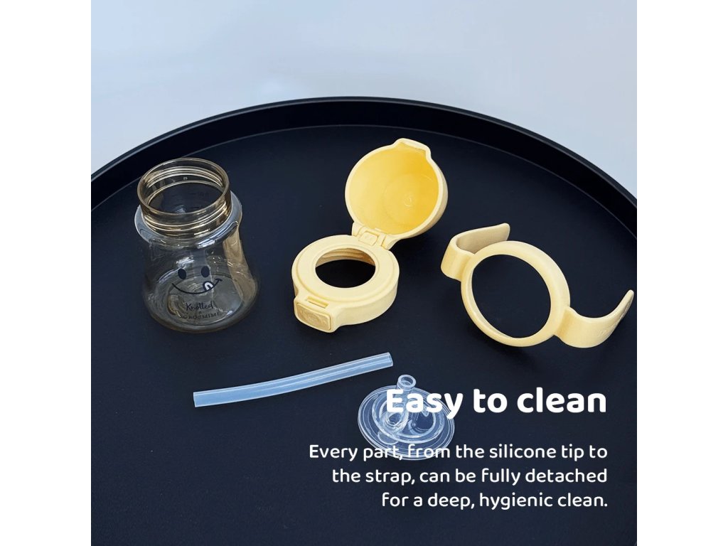 Fľaša je vybavená ergonomickými rukoväťami, ktoré sa otáčajú o 360°, čo umožňuje dieťaťu pohodlne držať fľašu z akéhokoľvek uhla. Rukoväte sú navrhnuté pre malé detské rúčky a podporujú samostatnosť pri pití. Rotačný mechanizmus znižuje zaťaženie zápästí a umožňuje prirodzené držanie.