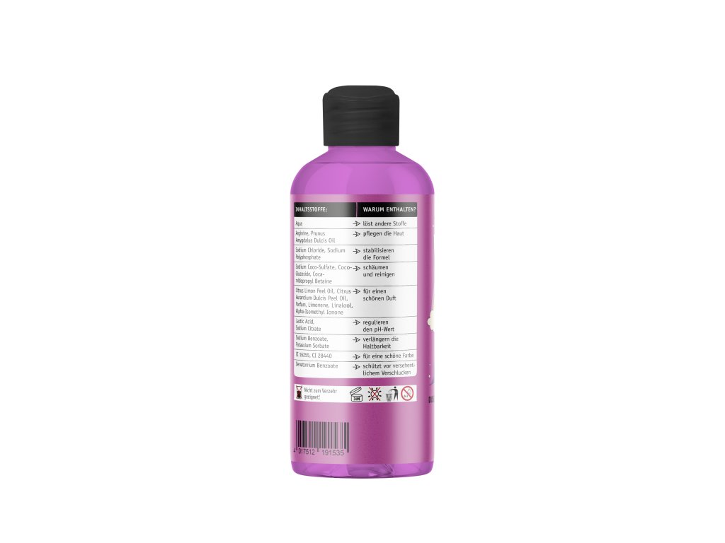 Aqua, Sodium Coco-Sulfate, Coco-Glucoside, Cocamidopropyl Betaine, Sodium Chloride, Citrus Limon Peel Oil, Citrus Aurantium Dulcis Peel Oil, Arginine, Prunus Amygdalus Dulcis Oil, Lactic Acid, Sodium Polyphosphate, Sodium Citrate, Denatonium Benzoate, Sodium Sulfate, Sodium Benzoate, Parfum, Limonene, Linalool, Alpha-Isomethyl Ionone, CI 16255, CI 28440